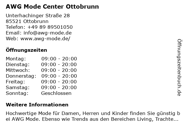 | Öffnungszeiten AWG Mode Center Ottobrunn in Ottobrunn anzeigen | |