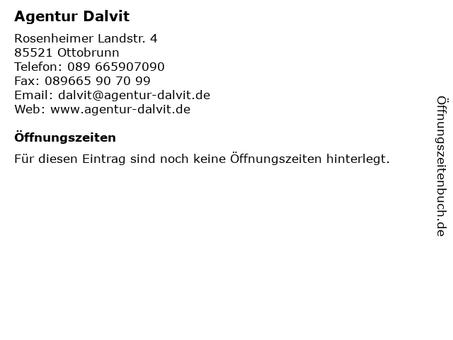 | Öffnungszeiten Agentur Dalvit in Ottobrunn anzeigen | |
