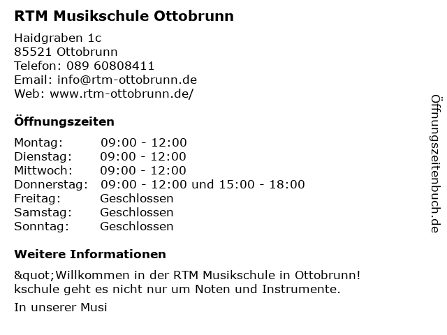| Öffnungszeiten RTM Musikschule Ottobrunn in Ottobrunn anzeigen | |