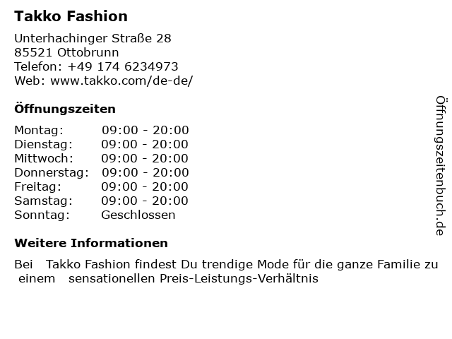 | Öffnungszeiten Takko Fashion in Ottobrunn anzeigen | |