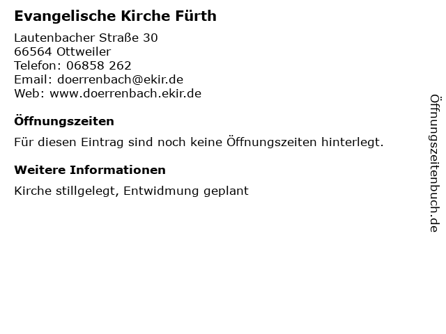 | Öffnungszeiten Evangelische Kirche Fürth in Ottweiler anzeigen | |