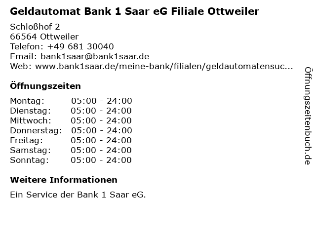 Öffnungszeiten Geldautomat Bank 1 Saar eG Filiale Ottweiler