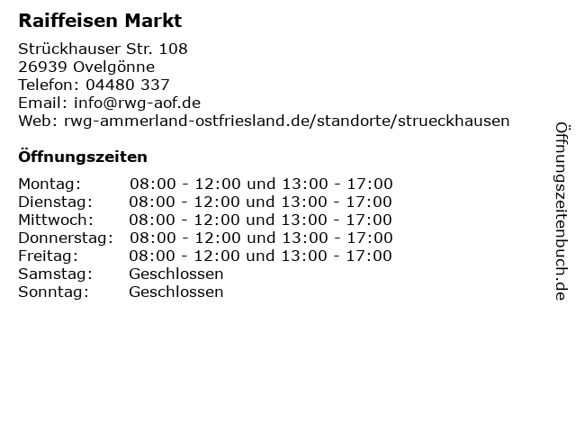 | Öffnungszeiten Raiffeisen Markt in Ovelgönne anzeigen | |
