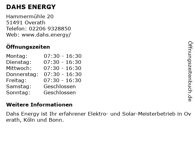 | Öffnungszeiten DAHS ENERGY in Overath anzeigen | |
