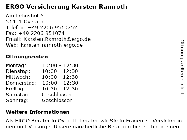 5 ERGO Versicherung Sebastian Clauß Agentur Versicherungsvermittler (Entfernung: 6,67 km) Im Binsenfeld 3, 51515 Kürten 6 ERGO Versicherung Andreas Hoh Fachagentur Versicherungsvermittler (Entfernung: 6,73 km) Jahnstr. 9, 51515 Kürten |