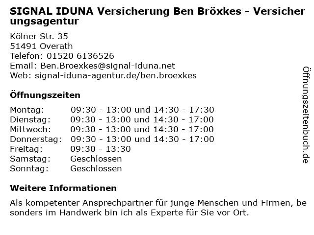 1 SIGNAL IDUNA Versicherung Sven Achenbach - Versicherungsagentur (Entfernung: 0,00 km) Kölner Str. 35, 51491 Overath 4 SIGNAL IDUNA Versicherung Dominik Rothstein - Versicherungsagentur (Entfernung: 0,04 km) Kölner Str. 37, 51491 Overath 6 |