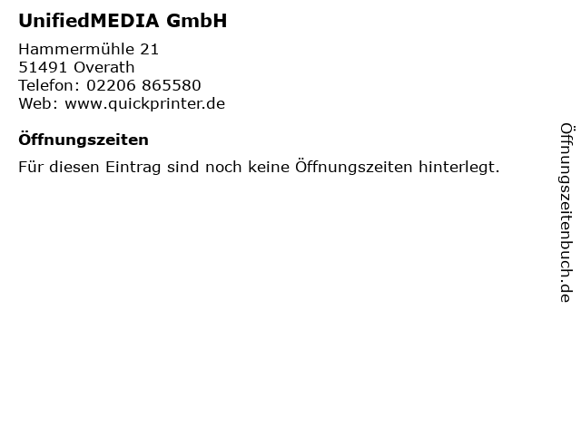 | Öffnungszeiten UnifiedMEDIA GmbH in Overath anzeigen | |