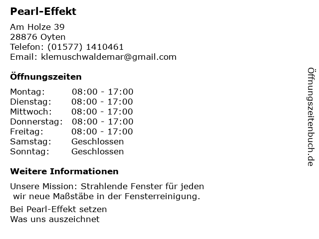 | Öffnungszeiten Pearl-Effekt in Oyten anzeigen | |