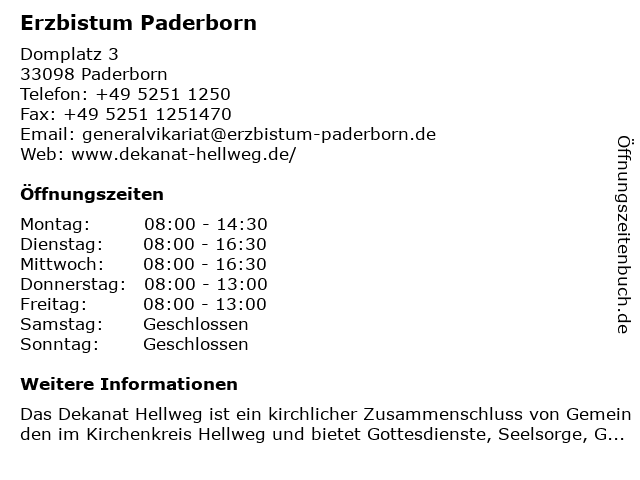 | Öffnungszeiten Erzbistum Paderborn in Paderborn anzeigen | |