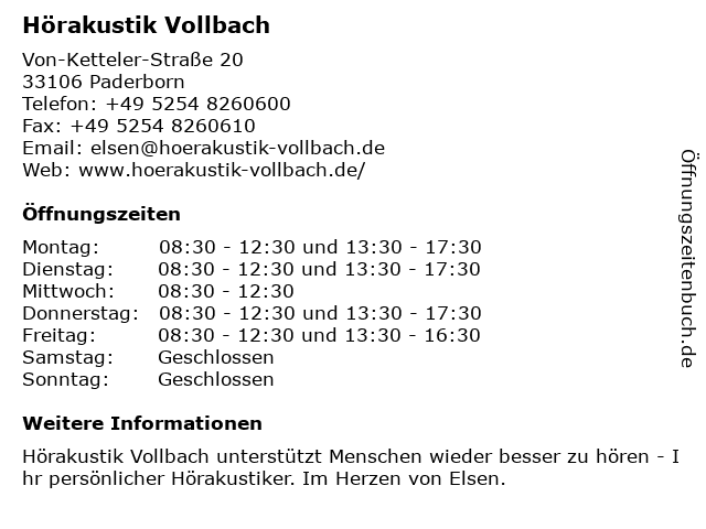 | Öffnungszeiten Hörakustik Vollbach in Paderborn anzeigen | |