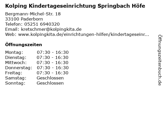 3 Kolping Berufsförderungszentrum Paderborn/Höxter, Unterrichtsstätte Paderborn (Entfernung: 2,69 km) Otto-Stadler-Str. 9, 33100 Paderborn 6 Kolping Kindertageseinrichtung Bad Lippspringe (Entfernung: 6,71 km) Kalberkampsweg 6, 33175 Bad Lippspringe |