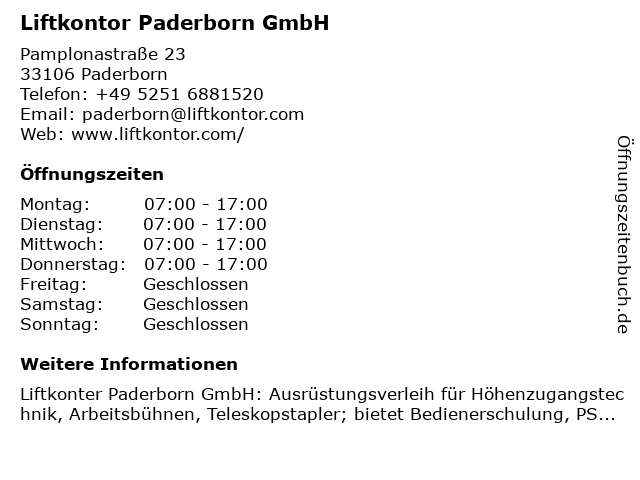 | Öffnungszeiten Liftkontor Paderborn GmbH in Paderborn anzeigen | |