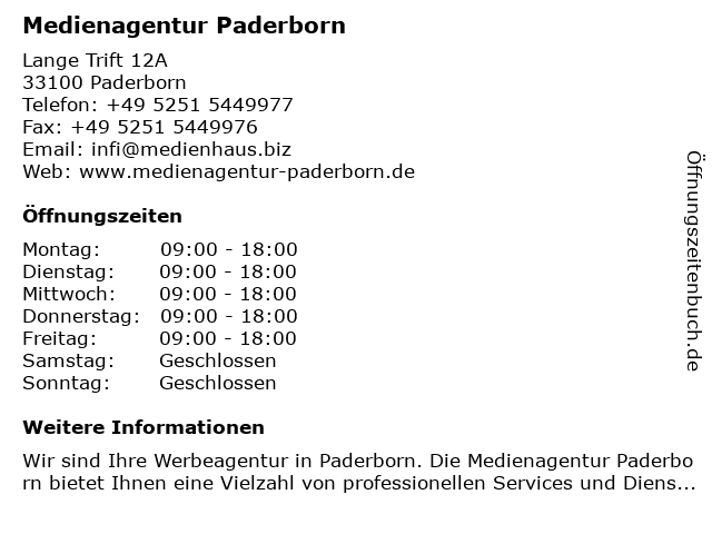 | Öffnungszeiten Medienagentur Paderborn in Paderborn anzeigen | |