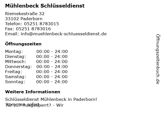 | Öffnungszeiten Mühlenbeck Schlüsseldienst in Paderborn anzeigen | |