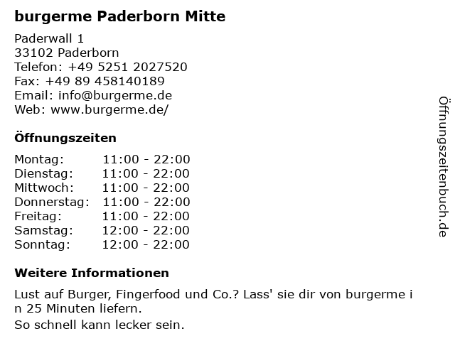 | Öffnungszeiten burgerme Paderborn Mitte in Paderborn anzeigen | |