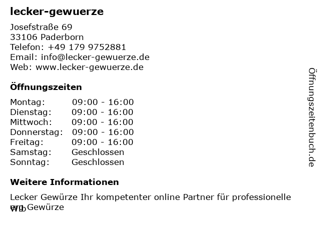 | Öffnungszeiten lecker-gewuerze in Paderborn anzeigen | |