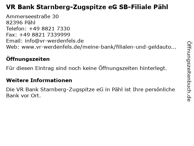 | VR Bank Starnberg-Zugspitze eG SB-Filiale Pähl anrufen | |