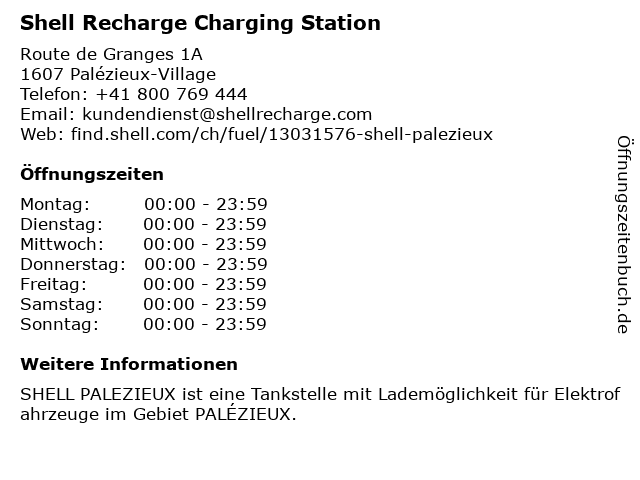 4 Shell Recharge Charging Station (Entfernung: 5,26 km) Route du Lac Lussy 180, 1618 Châtel-Saint-Denis 6 |