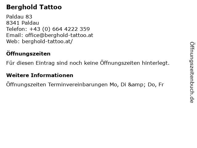 | Öffnungszeiten Berghold Tattoo in Paldau anzeigen | |