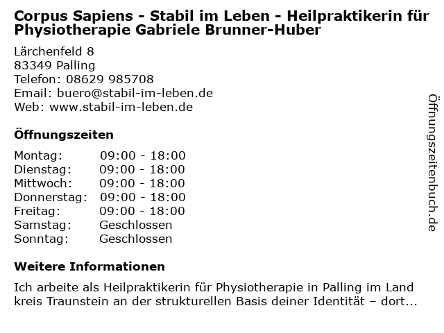 Branchen & Suchbegriffe zu Corpus Sapiens - Stabil im Leben - Heilpraktikerin für Physiotherapie Gabriele Brunner-Huber:brunner, corpus, gabriele, heilpraktikerin, huber, leben, lebenscoaching, physiotherapie, sapiens, stabil |