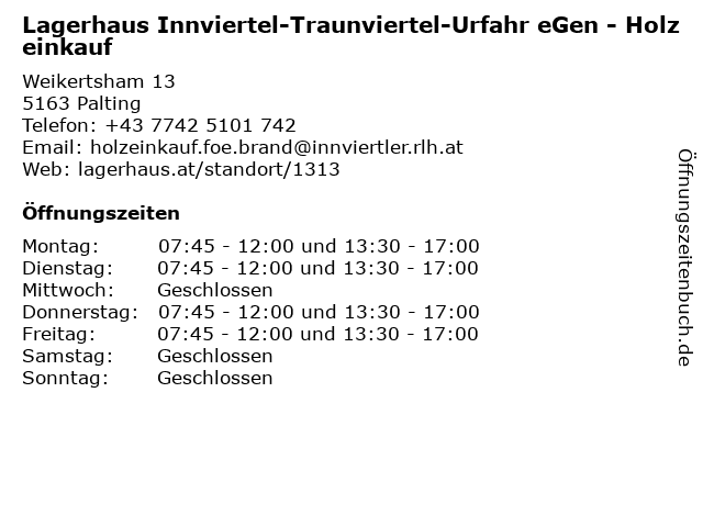 1 Innviertler Lagerhausgenossenschaft eGen - Rundholzhandel (Entfernung: 10,70 km) Gundertshausen 48, 5142 Eggelsberg 2 Innviertler Lagerhausgenossenschaft eGen - Rundholzhandel (Entfernung: 16,96 km) Obereck 37, 5242 St. Johann 3 Innviertler Lagerhausgenossenschaft eGen - Rundholzhandel (Entfernung: 19,48 km) Bahnhofstraße 32, 5270 Mauerkirchen 4 Lagerhaus Innviertel-Traunviertel-Urfahr eGen - Agrar, Baustoffe und Brennstoffe (Entfernung: 0,00 km) Weikertsham 13, 5163 Palting 6 Raiffeisenbank Salzburger Seenland eGen - (Bankomat Bankstelle) (Entfernung: 4,29 km) Franz-Xaver-Gruber-Platz 2, 5165 Berndorf |