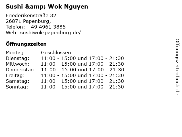 | Öffnungszeiten Sushi & Wok Nguyen in Papenburg, anzeigen | |
