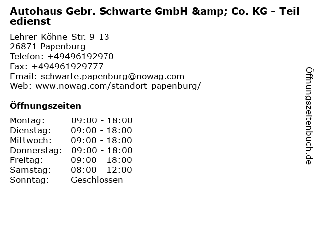 1 Autohaus Gebr. Schwarte - Ausstellungshalle (Entfernung: 0,01 km) Lehrer-Köhne-Str. 9-13, 26871 Papenburg 4 Gebr. Simon und Albert Liebsch, Wilfried Liebsch e. K. (Entfernung: 11,26 km) Dorfstr. 29, 26826 Weener 6 |