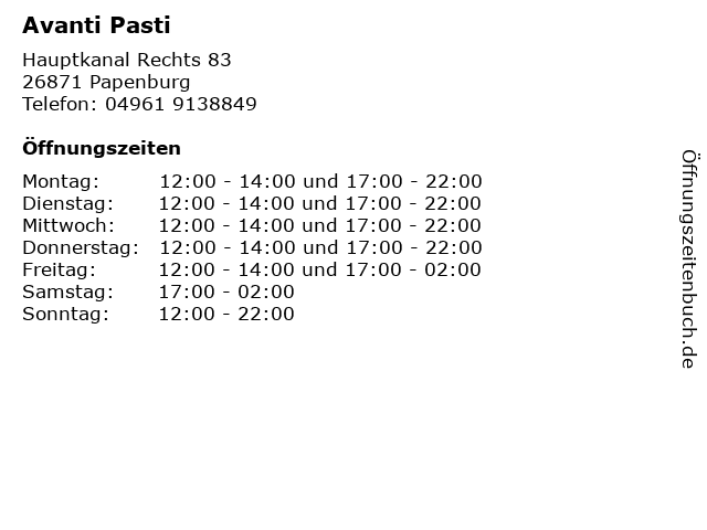 | Öffnungszeiten Avanti Pasti in Papenburg anzeigen | |