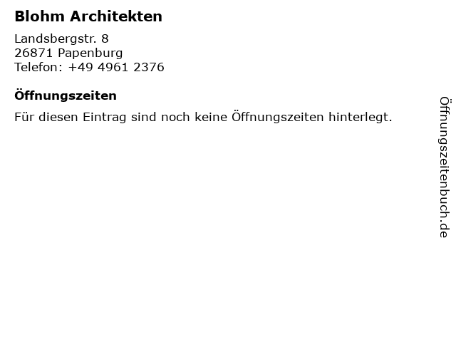 | Öffnungszeiten Blohm Architekten in Papenburg anzeigen | |