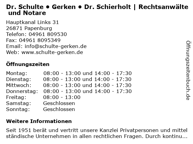 1 Kanzlei Dr. Schulte & Gerken, Rechtsanwälte & Notare (Entfernung: 0,00 km) Hauptkanal links 31, 26871 Papenburg 2 NIES STOLTE MEYER Notare, Rechtsanwälte, Fachanwälte (Entfernung: 0,13 km) Hauptkanal links 24, 26871 Papenburg 3 Heinrich Schulte Stahlbau und Schlosserei (Entfernung: 0,39 km) Hauptkanal links 8 -9, 26871 Papenburg 6 |