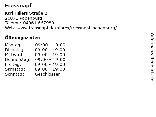 | Öffnungszeiten Fressnapf in Papenburg anzeigen | |
