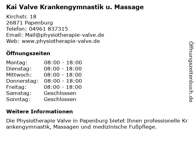 Branchen & Suchbegriffe zu Kai Valve Krankengymnastik u. Massage:kai, krankengymnastik, massage, massagezentrum, u., valve |