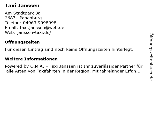 | Öffnungszeiten Taxi Janssen in Papenburg anzeigen | |