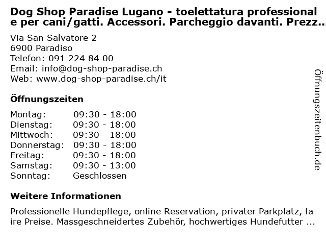 Branchen & Suchbegriffe zu Dog Shop Paradise Lugano - toelettatura professionale per cani/gatti. Accessori. Parcheggio davanti. Prezzi ragionevoli.:accessori., cani/gatti., davanti., dog, heimtierbedarf, lugano, paradise, parcheggio, per, prezzi, professionale, ragionevoli., shop, tierfriseur, tierhandlung, toelettatura |
