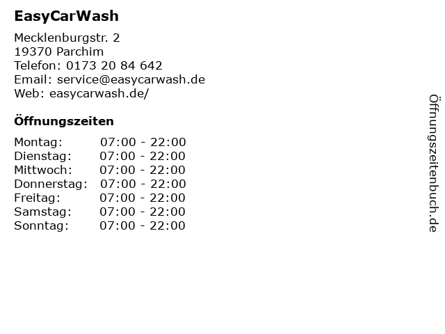 | Öffnungszeiten EasyCarWash in Parchim anzeigen | |