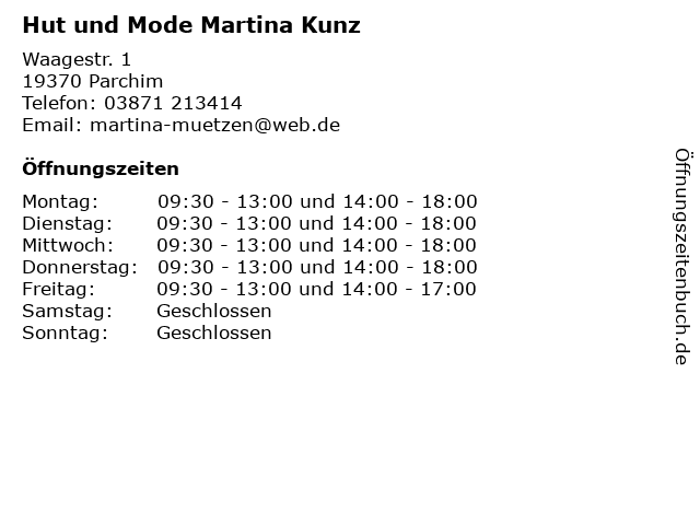 | Öffnungszeiten Hut und Mode Martina Kunz in Parchim anzeigen | |