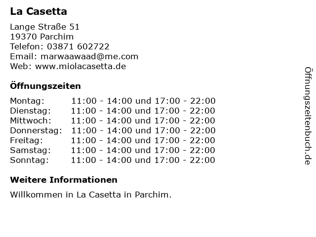 | Öffnungszeiten La Casetta in Parchim anzeigen | |