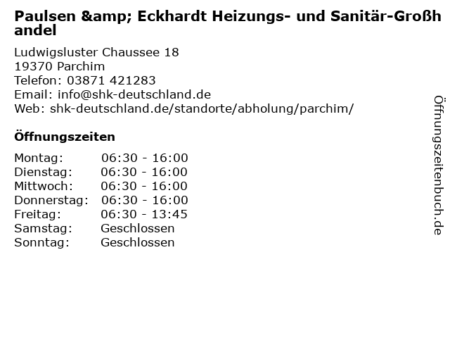 2 Hansen Uwe Heizungs- und Sanitäranlagen GmbH (Entfernung: 2,84 km) Voigtsdorfer Weg 39, 19370 Parchim 4 Bernd Schröder Heizungs- und Sanitärtechnik (Entfernung: 16,42 km) Grüner Weg 1a, 19089 Zapel bei Crivitz 6 |