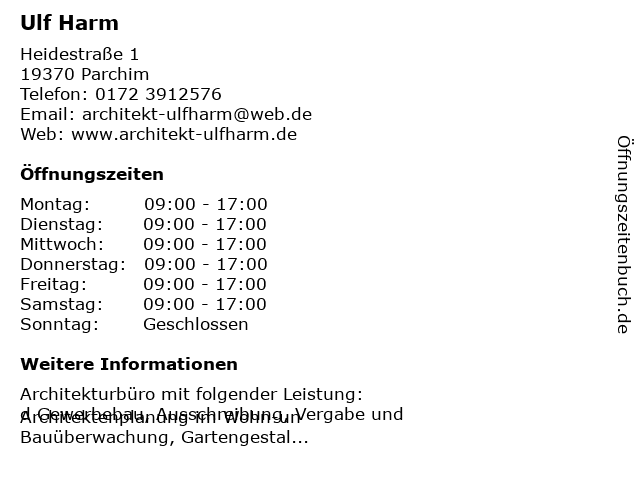 | Öffnungszeiten Ulf Harm in Parchim anzeigen | |