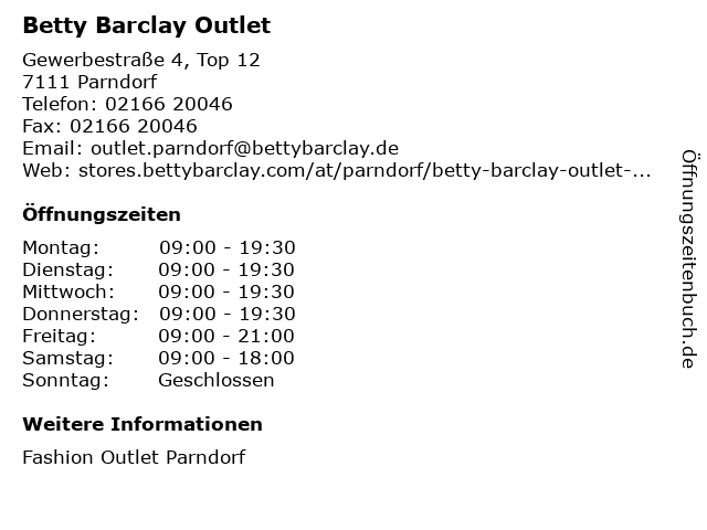 | Öffnungszeiten Betty Barclay Outlet in Parndorf anzeigen | |