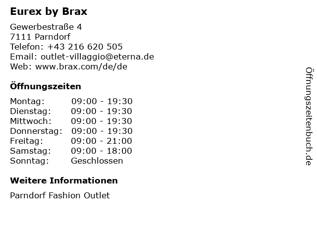 | Öffnungszeiten Eurex by Brax in Parndorf anzeigen | |
