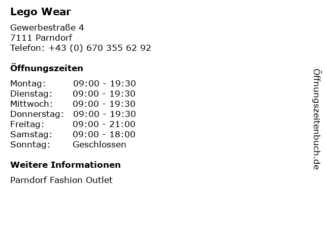 | Öffnungszeiten Lego Wear in Parndorf anzeigen | |
