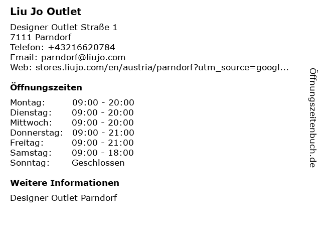 | Öffnungszeiten Liu Jo Outlet in Parndorf anzeigen | |