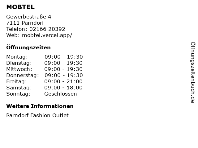 | Öffnungszeiten MOBTEL in Parndorf anzeigen | |
