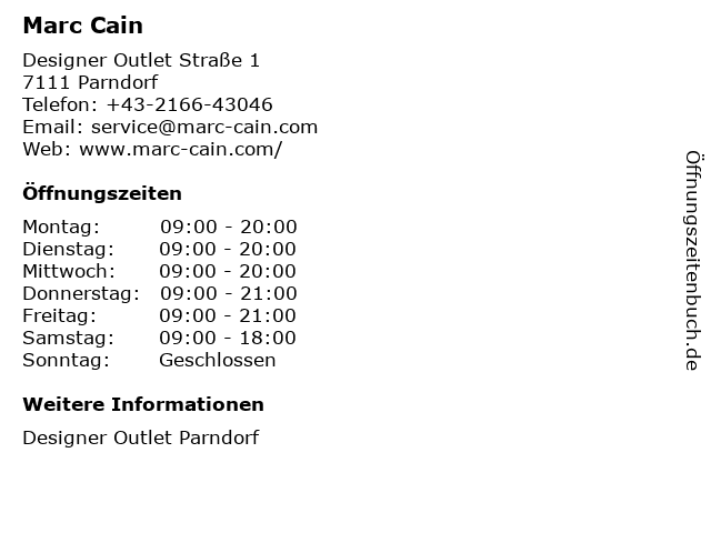 | Öffnungszeiten Marc Cain in Parndorf anzeigen | |