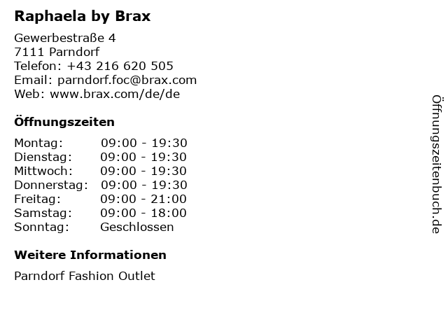 | Öffnungszeiten Raphaela by Brax in Parndorf anzeigen | |