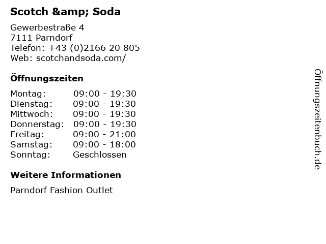 | Öffnungszeiten Scotch & Soda in Parndorf anzeigen | |