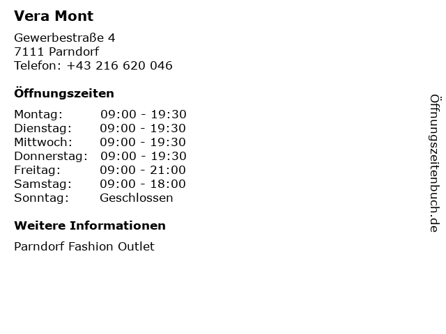 | Öffnungszeiten Vera Mont in Parndorf anzeigen | |