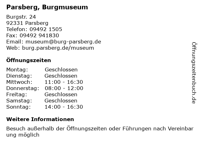 | Öffnungszeiten Parsberg, Burgmuseum in Parsberg anzeigen | |