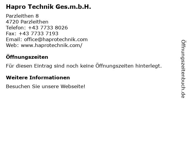 | Öffnungszeiten Hapro Technik Ges.m.b.H. in Parzleithen anzeigen | |